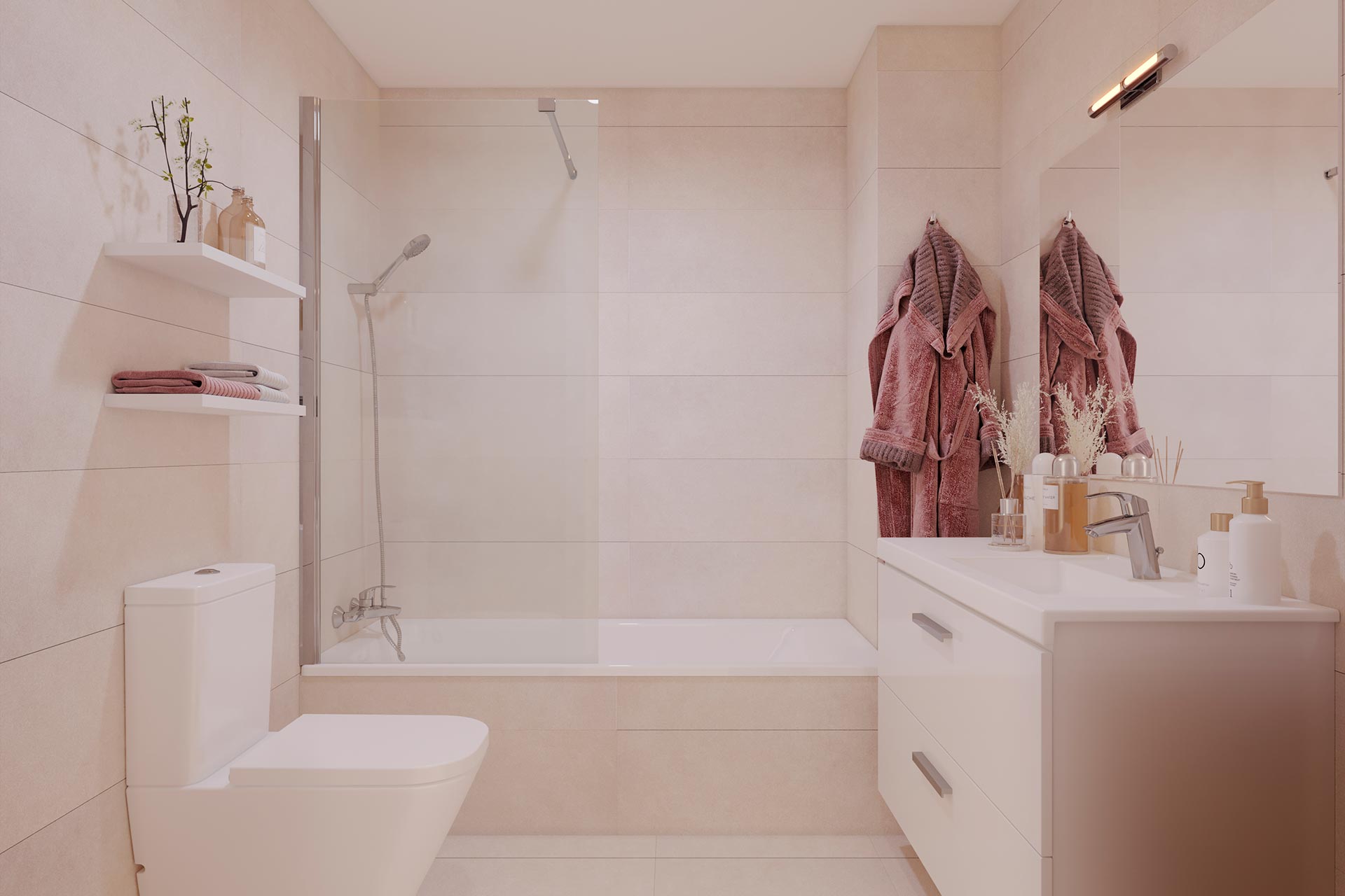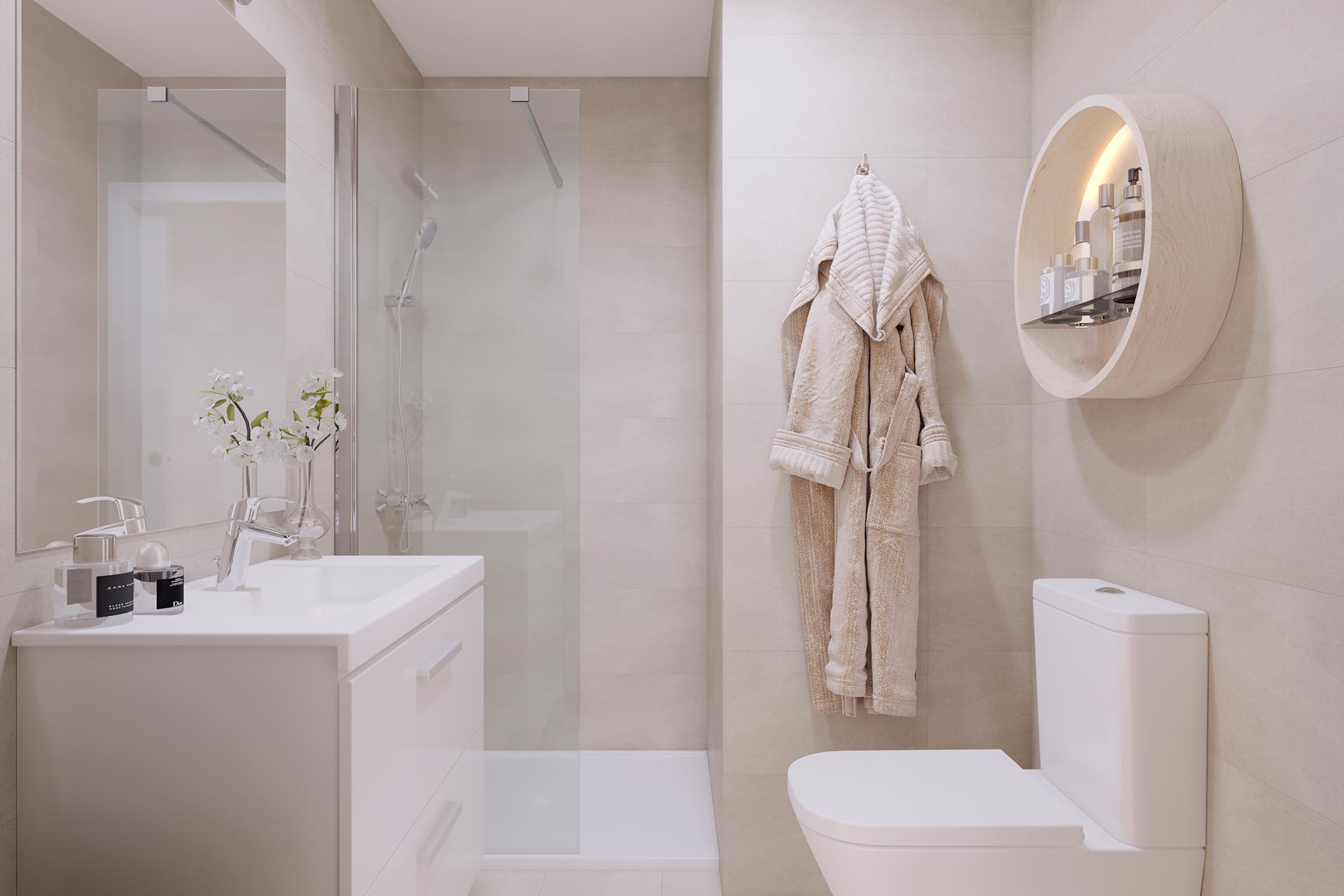 Los suelos serán de gres con alicatado de paramentos verticales con gres. Falsos techos con pintura plástica lisa. Aparatos sanitarios de porcelana esmaltada de ROCA. Platos de ducha Cratos, de ROCA con mamparas fijas y bañeras de chapa esmaltada Easy de ROCA. Habrá un mueble de lavabo y espejo.
